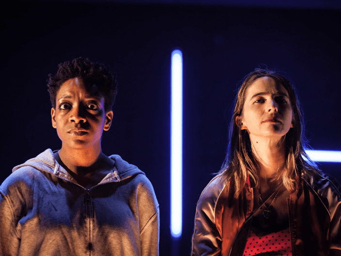 Celles qui viennent porter cette histoire ce sont Stella et Adèle. Interprétées brillamment et avec beaucoup de force par Astrid Bayiha et Nathalie Bourg. On a réellement l’impression d’être face à deux jeunes de 17 ans, tant la finesse et la subtilité de leur jeu nous plonge dans la fiction. Irrévérencieuses et rebelles, elles agrippent le spectateur pour ne plus le lâcher tant que leur histoire n’aura pas eu raison de lui. Leur engagement sur scène est fort, généreux, et on a bien du mal à les quitter. Duo complice, elles imaginent, comme le ferait un enfant qui s’invente un monde, l’histoire des habitants de leurs résidences. Les inconnus derrière leurs fenêtres sur cour, allumées au beau milieu de la nuit. Elles inventent des histoires pour échapper à la leur, jusqu’à que celle-ci les rattrape avant de les étouffer. C’est un vrai cri qui retentit sur scène. Un spectacle à encaisser, qui ne laisse pas indemne, mais qui étrangement fait du bien à recevoir, et défend un discours qui a l’urgence d’être entendu.